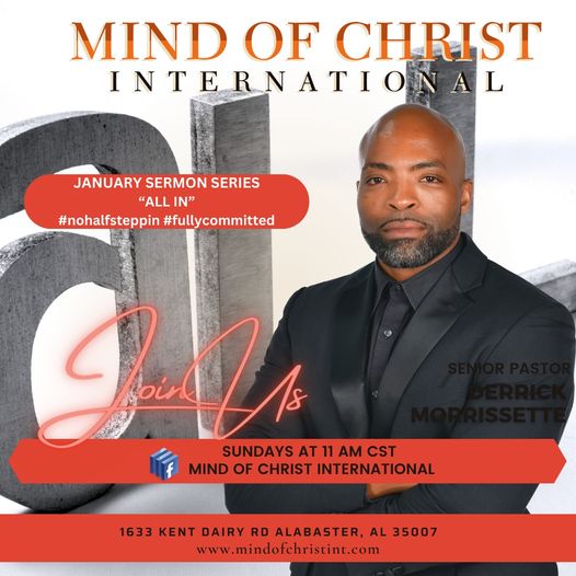 Make your way to Mind of Christ International this Sunday as we continue our “ALL IN” series. You can join us in person or via Facebook live. We would love to have you worship with us!