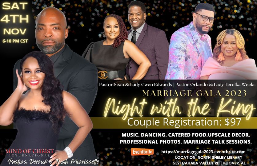 Night with the King Marriage Gala 2023! Get ready for a night of romance like never before! Ladies, find your best dress. Men, grab your best suit. It’s on! Whether you are dating, engaged or married…come and get empowered on what a HEALTHY marriage can look like for you!